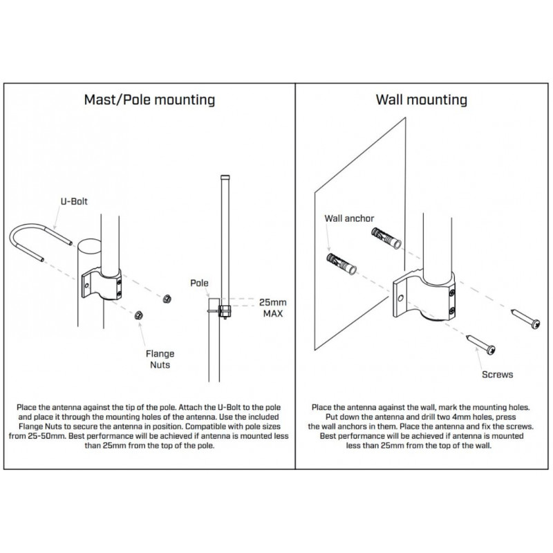 Mikrotik Omni antena LoRa z ojačanjem 6,5 dBi širokopasovna 824- 60 MHz z SMA ženskim konektorjem, UV in zaščito IP66. Paket vsebuje montažno objemko za drog 25 do 50 mm in osnovni podaljšek kabla RF dolžine 1m z 2x SMA Male.