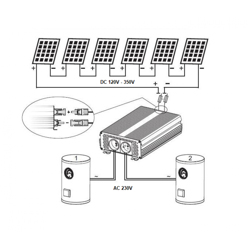 Sistem deluje tako, da DC enosmerni tok, proizveden v solarnih kolektorjih, katerega ni mogoče neposredno uporabljati npr. napetosti 120V-350V. Se uporablja za direktno pretvorbo npr. potrošniške grelne naprave za gretje vode ali ogrevanje prostora. V pretvorniku se pretvori napetost DC/AC z frekvenco izmeničnega toka, za neposredno rabo, kjer se lahko energija kopiči le takrat, ki je na voljo brez akomulacije. Največja moč sistema je do 3kW, inverter ima prednostni izhod "1", ki ima vedno napetost, in odvisni izhod "2", ki se vklopi, ko ni porabe energije na izhodu "1" in se izklopi, ko se energija ponovno odvzeta iz izhoda " 1 ".To vam omogoča povezavo npr. dveh grelnih naprav, dveh kotlov, od katerih se ogrel najprej eden, nato drugi, ko termostat za prvega preneha prejemati energijo iz pretvornika se vključi drugi. Zahvaljujoč vgrajeni MPPT funkciji se bo pretvornik samodejno prilagodil moči grelnika in nastavil svojo delovno točko tako, da bo prejeta energija iz sistema fotovoltaičnih modulov maksimalno izkoriščena.
