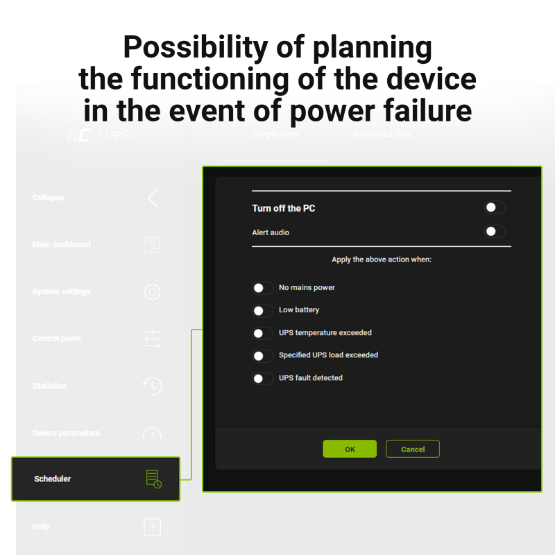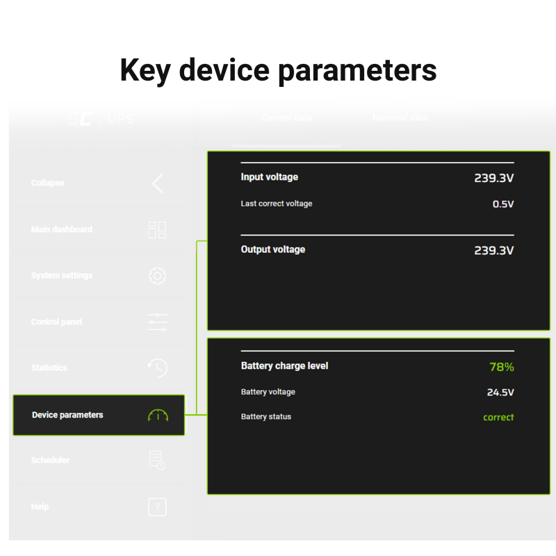 Da bi omogočili uporabo funkcij Green Cell UPS, je bila izdelana posebna namenska programska oprema, ki omogoča napredno upravljanje naprave. Aplikacija zagotavlja preprosto in intuitivno uporabo brez težav. Program omogoča predogled v realnem času in prikazuje podatke meritev, vključno z vhodno in izhodno napetostjo, frekvenco obremenitve UPS-a, njegovo temperaturo in kapaciteto baterije. Nastavite lahko samodejni izklop sistema, obvestila in e-poštna opozorila v primeru preklopa na delovanje s testom. O teh in drugih funkcijah lahko izveste tako, da prenesete programsko opremo iz strani proizvajalca.