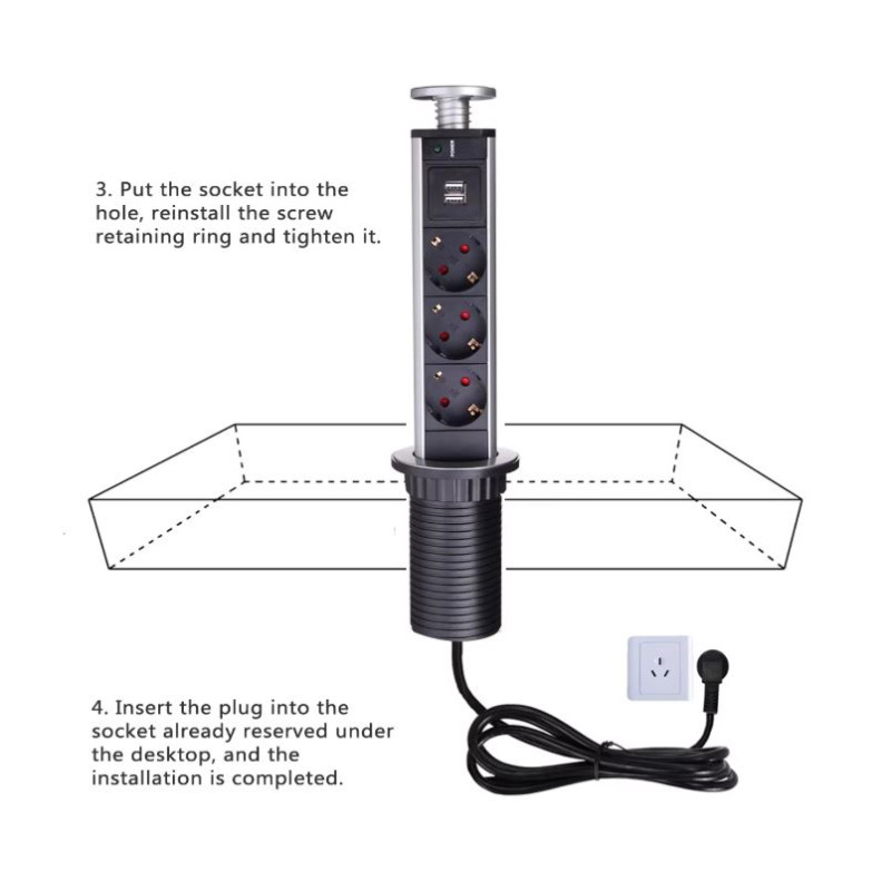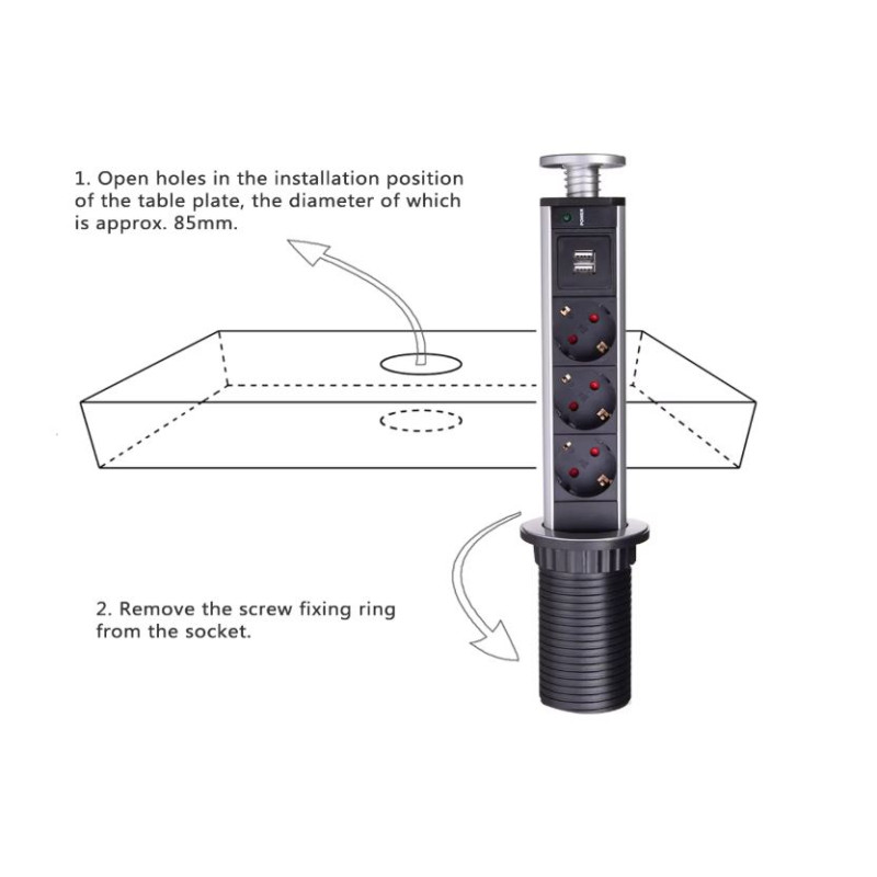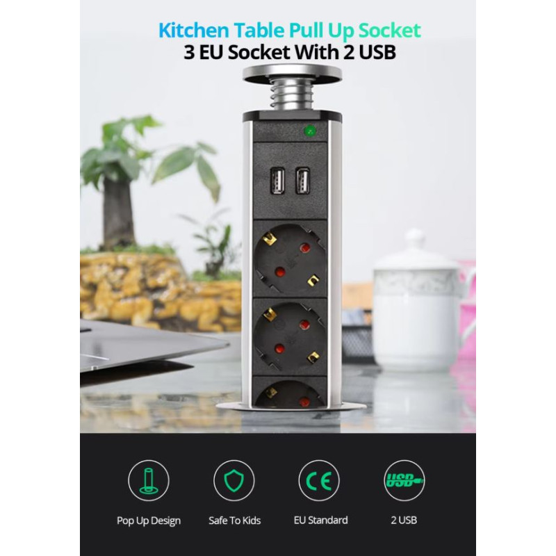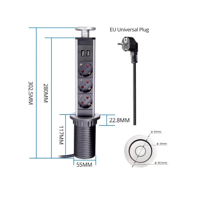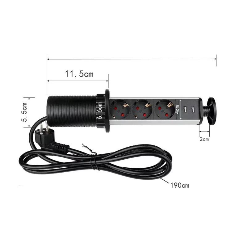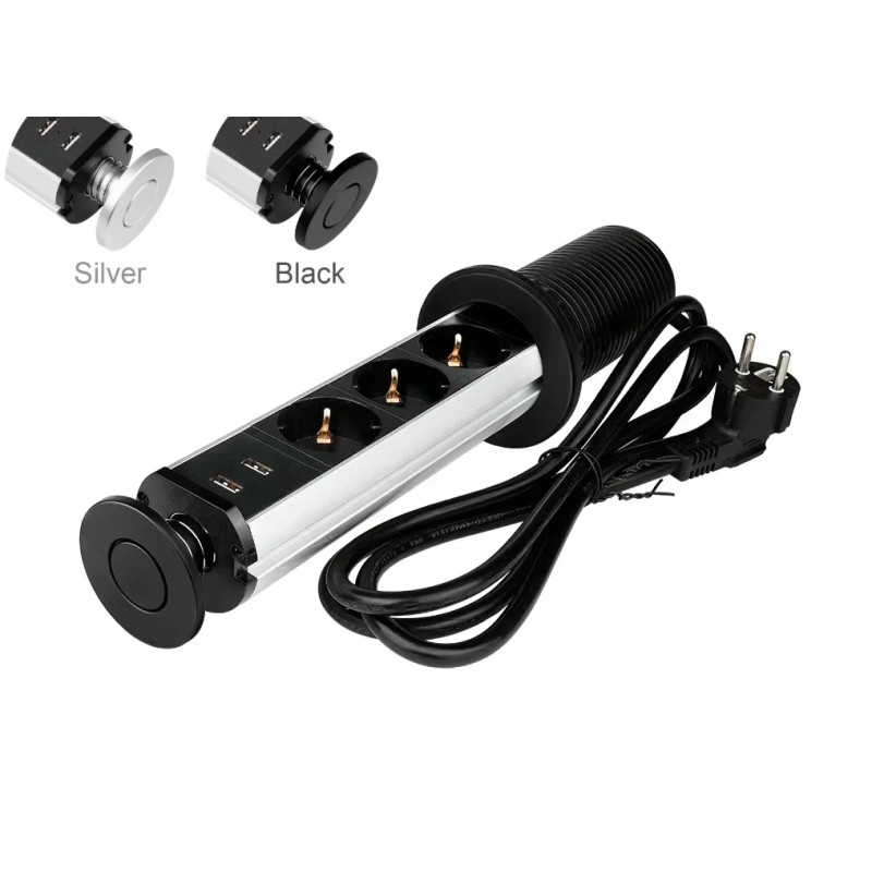 Namizna ročna potopna vtičnica z 3x EU suko vtičnicami z zaščito in 2x USB A stičnice za polnjenje multimedijskih naprav