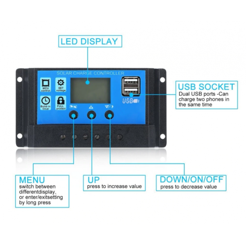 Osnovni LCD solarni polnilni regulator z PMW funkcijo. Velik LCD zaslov omogoča hiter in enostaven vpogled delovanja sistema. Regulator ima vse potrebne električne varnostne zaščite.