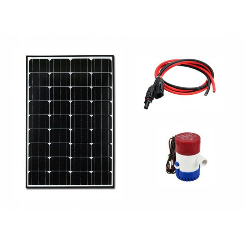 Solarni komplet ribnik za letno zračenje in pretakanje stoječih ribnikov ali mlak sistema 12V je sestavljen iz mono solarnega panela 100W, enostransko zaključenega solarnega flex halogen kabla z parom MC4 10m 2.5mm oz. 2x 5m, ter solarnega shur bilge črpalke 45W 1100GPH