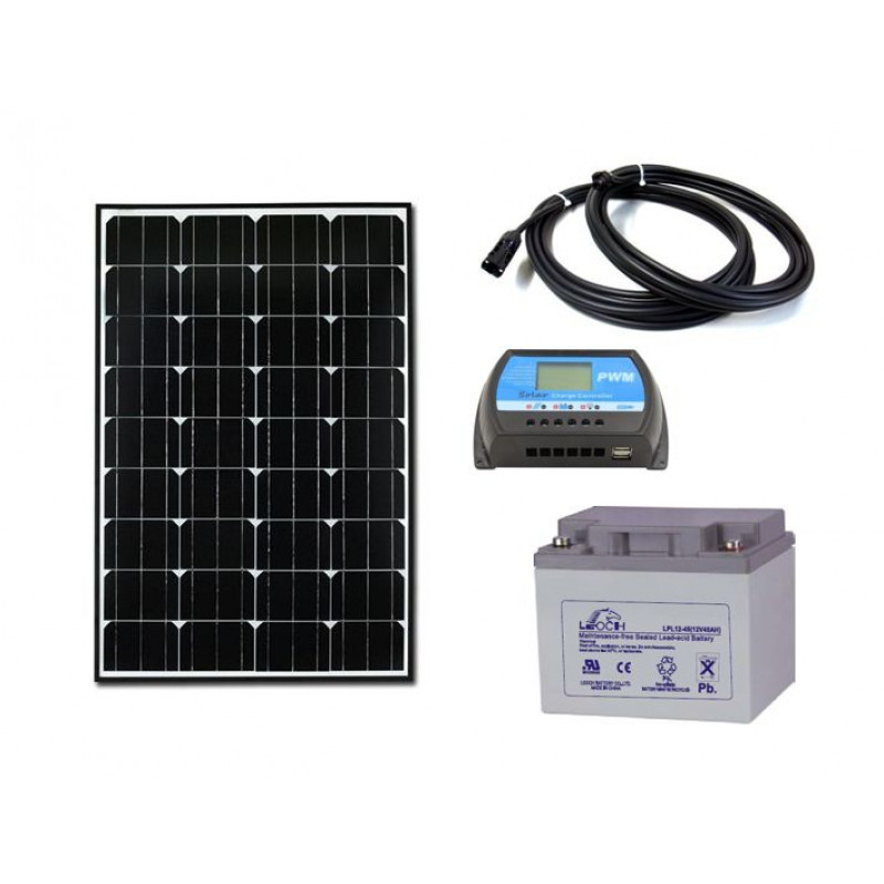 Solarni komplet unierzal sistema 12V je sestavljen iz mono solarnega panela 100W, enostransko zaključenega solarnega flex halogen kabla z parom MC4 10m 4mm oz. 2x 5m, solarnega regulatorja polnjenja PMW 12V 10A z USB in delovne agm suhe svinčene gel baterije 45Ah.