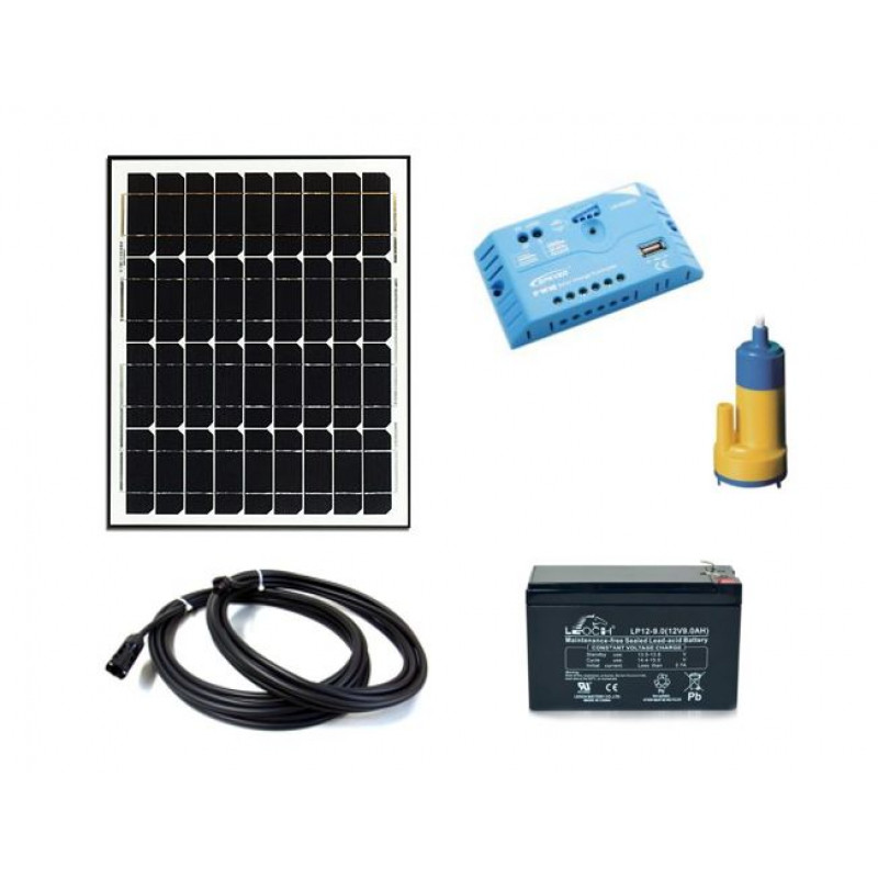 Solarni komplet unierzal sistema 12V je sestavljen iz mono solarnega panela 30W, enostransko zaključenega solarnega flex halogen kabla z parom MC4 10m 2.5mm oz. 2x 5m, solarnega regulatorja polnjenja 12V 5A, potopna pumpa barwing črpanje ali zalivanje z čisto vodo na vrtu, vikendu ali kampu ter delovne agm suhe svinčene gel baterije 9Ah.
