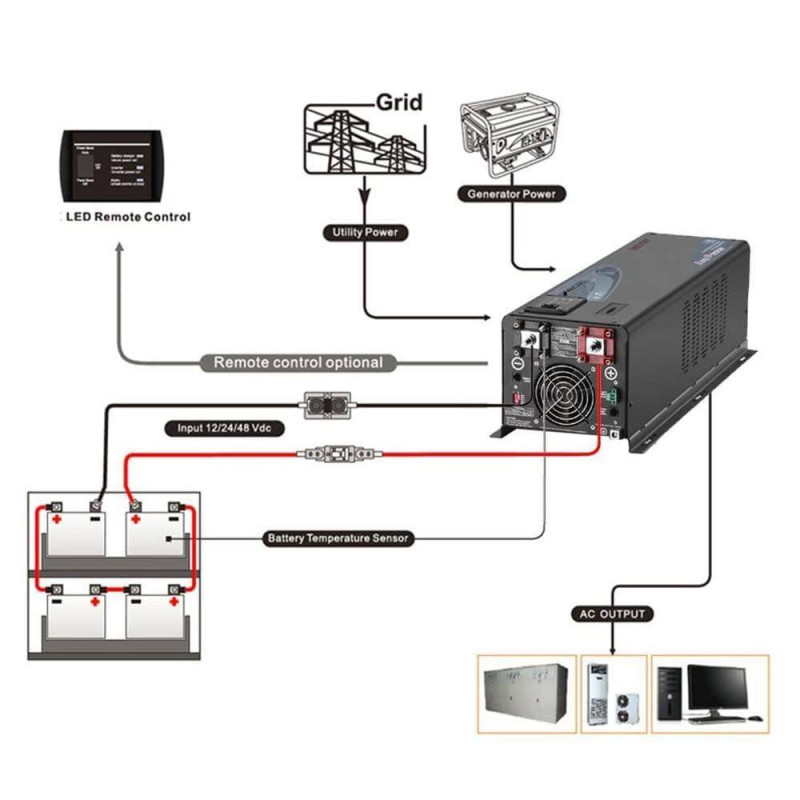 Trajna moč je 5000W, trenutna moč je približno 300% nazivne moči (15000W), vzdržuje se lahko približno 20 sekund. Ponujeni izdelek lahko deluje kot omrežno stikalo v načinu "omrežje/baterija" (ko se izmenični tok izklopi ali pade pod dovoljeno območje, se obremenitev prenese na izhod inverterja - baterija in po ponovni vzpostavitvi omrežnega napajanja , se breme vrne v električno omrežje) ali "baterija/omrežje" (največja uporaba energije iz zunanjih virov energije, kot so sistemi obnovljive energije).