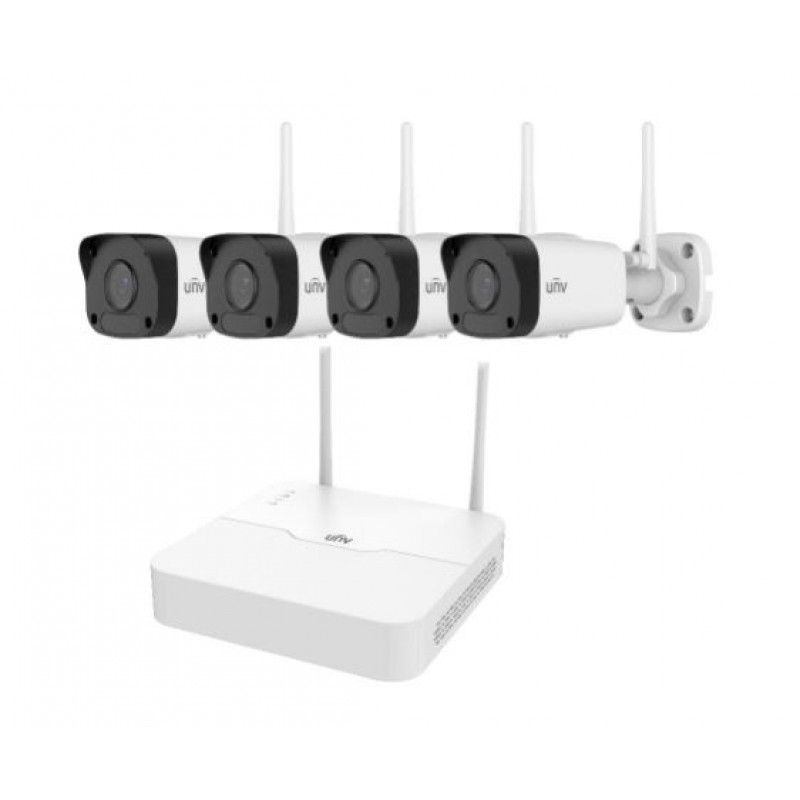 WiFi UNV komplet s snemalnikom NVR301-04L-W in komplet usmerjenih wifi kamer 4x IP kamera bullet IPC2124LR3-F40W-D 4MP 4mm IR30m, možnost napajanja 12V ali 802.3af. Podpora snemalnika NVR disk SATA 1TB-10TB podatkovni prenosi do 40Mbps in kodiranje Ultra 265/H.265/H.264 tudi z podporo ONVIF.
