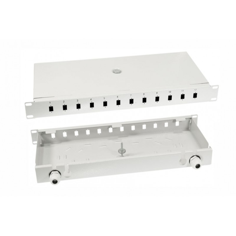 Rack optična razdelilna omarica za pritrditev v 19 "stojalo. Višina je 1U, izdelek je izdelan iz jeklene pločevine debeline 1 mm, prekrite z Magnelis prevleko. Na zadnji strani in na straneh so prazne luknje, na sredini so številna rebra, ki omogočajo pritrditev kablov Sredinsko nameščen vijak se uporablja za pritrditev pladnja za spajanje. Sprednja plošča omogoča namestitev 12 SC Simplex ali LC Duplex adapterjev. Komplet ne vsebuje vijakov kasete adapterjev in ostalih spojnih elementov.