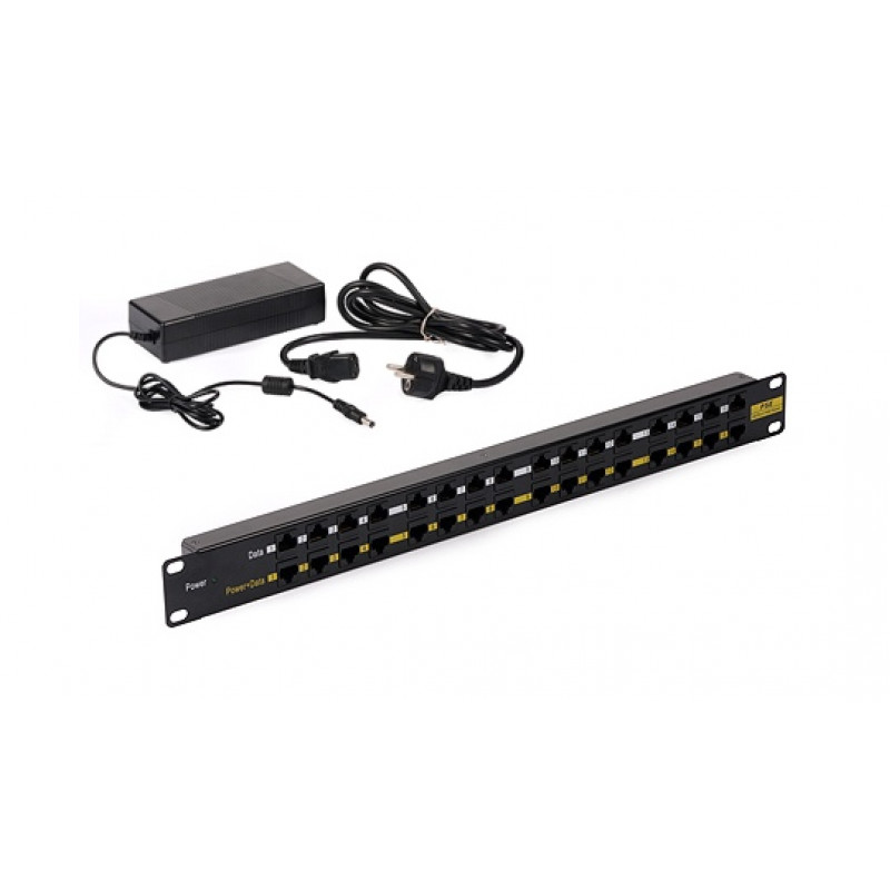 Pasivni rack PoE panel P1611B 48V-120W z usmernikom 230V, input-output 16x/16x port RJ45 10/100Mbps, raster rack 1U, max poraba na port 650mA