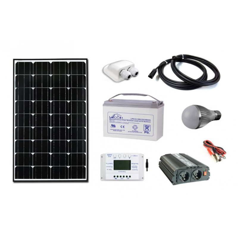 Solarni komplet vikend sistema 12V je sestavljen iz mono solarnega panela 130W, enostransko zaključenega solarnega flex halogen kabla z parom MC4 10m 4mm oz. 2x 5m, solarnega regulatorja polnjenja PMW 12V 20A z USB, zatemnilnega solarnega senzorja, solarnega led reflektorja 10W in delovne agm suhe svinčene gel baterije 100Ah.
