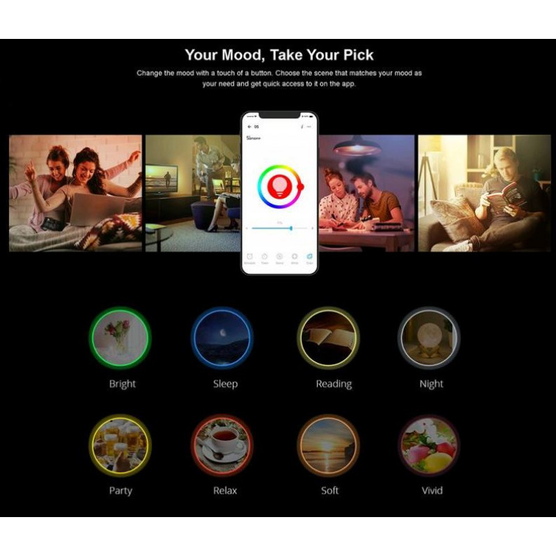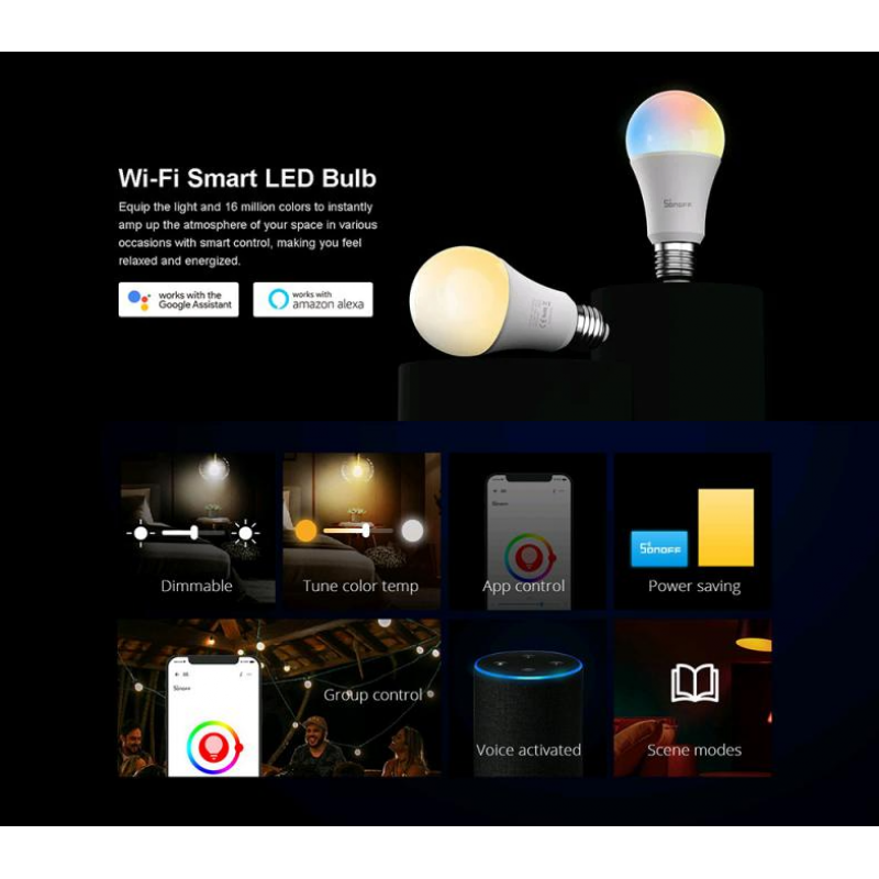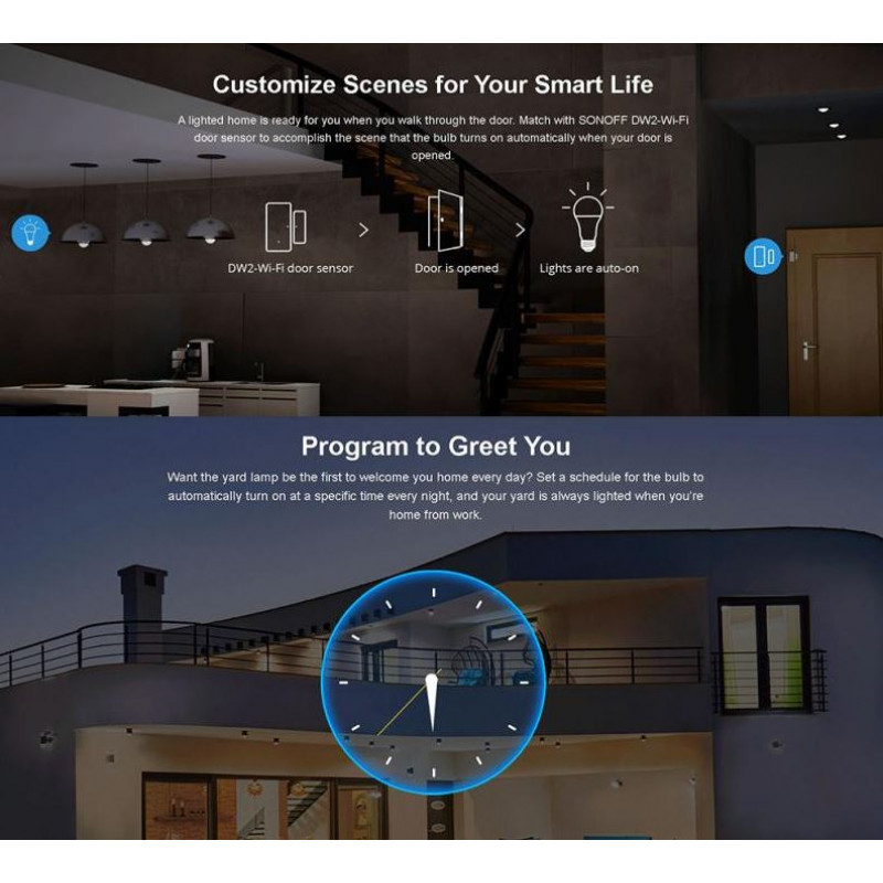 S senzorjem vrat SONOFF DW2-Wi-Fi lahko tudi nastavite žarnico tako, da vklopi ali izklopi vaša vrata. Pametna LED žarnica SONOFF vam omogoča zatemnitev in prilagajanje različnih barvnih temperatur s premikanjem vrstice v aplikaciji. Ima širok razpon svetlosti, ki je od 2700K do 6500K, kar je dovolj svetlo za skoraj vsak prostor za uporabo. Deluje s pametnimi pomočniki drugih proizvajalcev prek podpore za Alexa in Google Home, tako da lahko upravljate žarnico, prilagajate svetlost in barvo s svojim glasom. Pametna žarnica s 7W lahko proizvede 60-vatno ekvivalentno moč 806 lumnov, kar znatno zmanjša vaš mesečni račun za elektriko. Poleg tega je bil zanesljiv s časovnim razporedom, zaradi katerega se žarnica samodejno vklopi in izklopi ob nastavljenem času dneva. Žarnica ima tudi osem izbirnih prednastavljenih scenskih načinov, ki vam omogočajo takojšen dostop do ambienta, ki ga želite poudariti. Če dobite več pametnih LED žarnic SONOFF, je funkcija skupinskega nadzora zelo priročna, da skupaj vklapljate in izklapljate ter prilagajate vso barvno temperaturo in svetlost na isto raven s pritiskom na aplikacijo.
