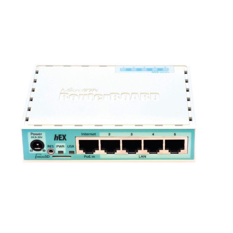 hEX je majhen petvratni gigabitni ethernetni usmerjevalnik v lepem plastičnem ohišju za upravljanje vašega žičnega SOHO omrežja. Od različice v3 ima usmerjevalnik vrata USB in režo za microSD.