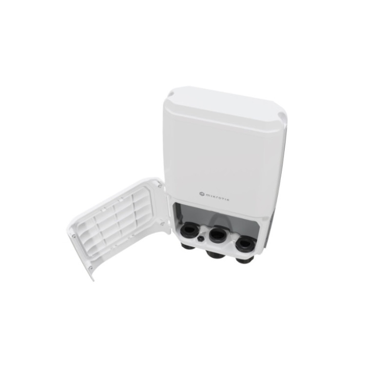 Zunanje 4-portno brez ventilatorsko stikalo QSFP28 z rebri na zadnji strani in možnostmi usmerjanja ponuja Gigabitni Ethernetza upravljanje ali napajanje PoE IN (43 do 57 V DC ali 802.3 bt),4 optična vrata QSFP28s hitrostjo 1/10/25/40 in 100 Gbps, konzolnim priključkom RJ45, DC konektorjem in priključnim blokom z napajanjem od 43 do 57 V DC Switch ima zelo robustno ohišje z zaščita pred vodo IP66, možnost namestitve na steno ali jambor, v spodnjem delu pa so vratca za 4 križne vijake in 3 velike kabelske uvodnice z dovolj prostora za vse kable. V notranjosti naprave sta nameščena tako RouterOS v7 z licenco L5 kot SwitchOS, ki je namenjen lažjemu upravljanju.