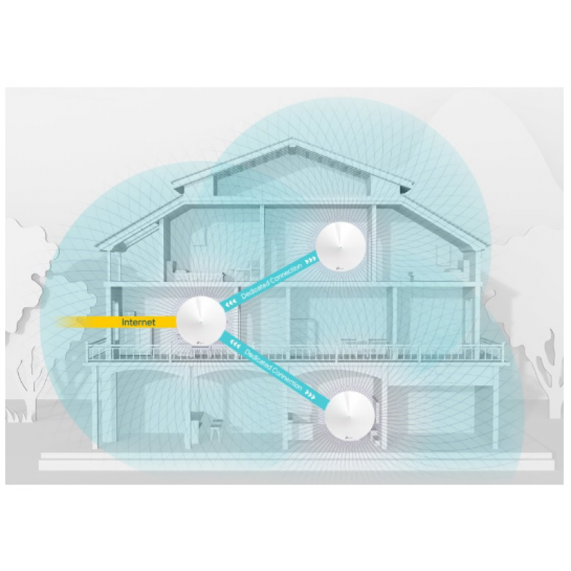 Deco je najpreprostejši način, da zagotovite močan Wi-Fi signal v vsakem kotičku vašega stanovanja do 4500 kvadratnih metrov. Uživajte v hitrem in varnem tripojasnem brezžičnem omrežju, ne glede na to, koliko naprav imate. Deco M9 Plus povezuje in nadzoruje vse vaše pametne domače naprave kot središče, dodatnega vozlišča ni potrebno.