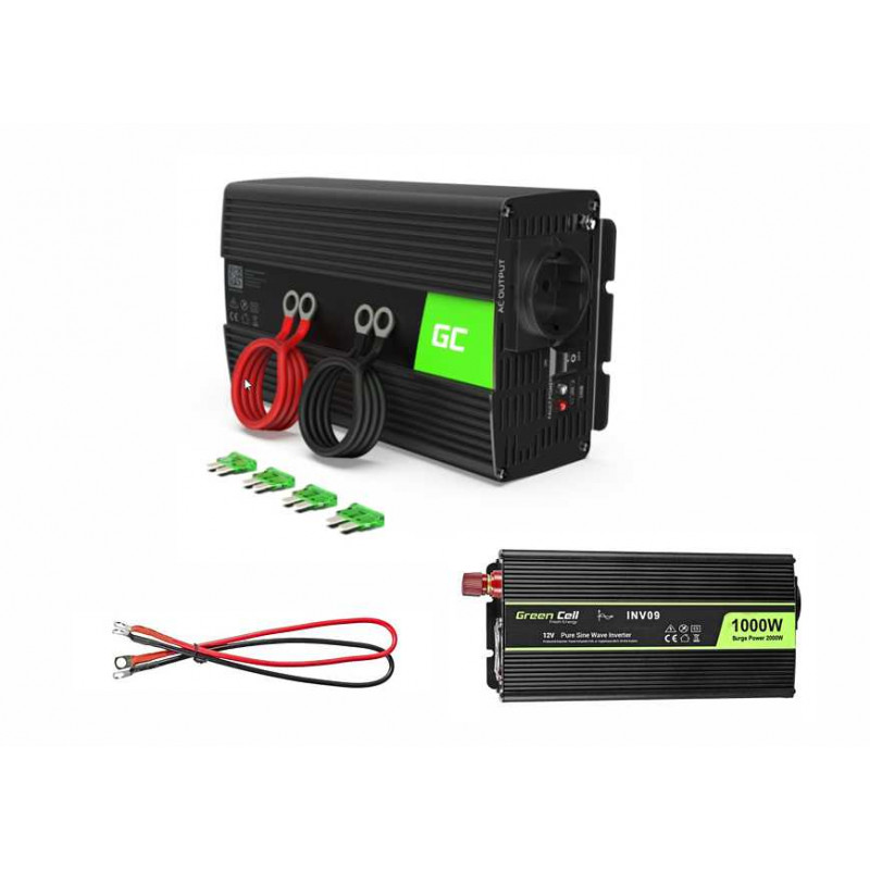 Green Cell pretvornik imitiranega sinusa INV23 DC24V na AC230V moči 1000W/2000W, priloženi priključni kabli baterije in USB polnjenja elektronike