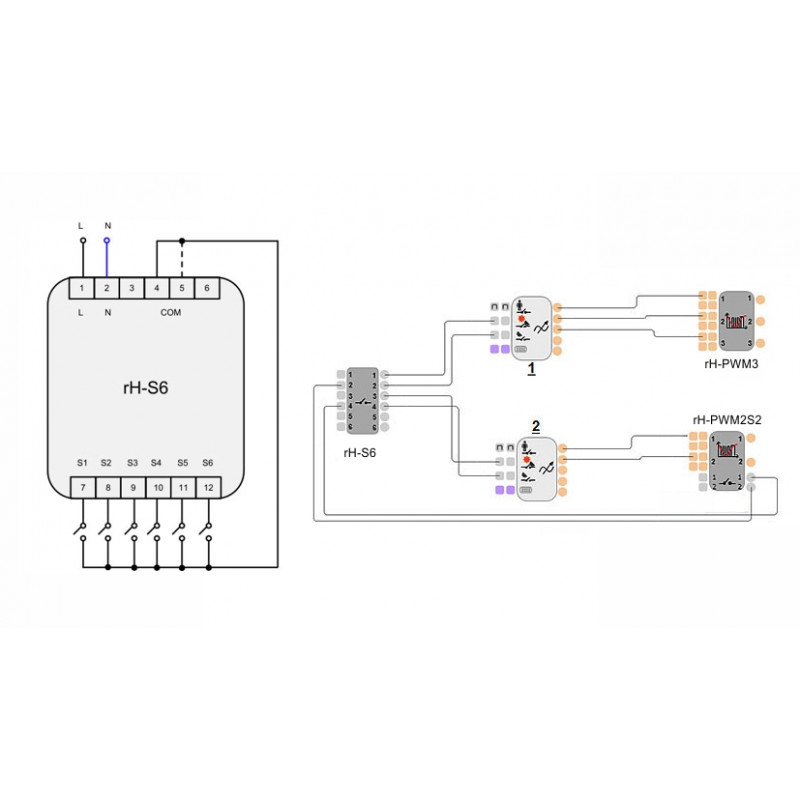 V zgornjem diagramu se modul rH-S6 uporablja za vklop / izklop in spreminjanje prizorov na dveh območjih ali prostorih. Sprememba sproži trenutno stikalo, ki je priključeno na zatiči 1 ali 3 modula in ga izvaja prvi ali drugi logični predmet. Sprememba stanja na zatičih 2 ali 4 izklopi ustrezno svetlobno sceno. Modul rH-PWM3 lahko nadzoruje RGB LED trak za spreminjanje efektivne barve svetlobe v prizoru. Modul rH-PWM2S2 lahko nadzira svetlost svetlobe. Ta predmet je povezan z modulom rH-S6 . Momentna stikala, povezana z vhodi, lahko izklopijo prizore.