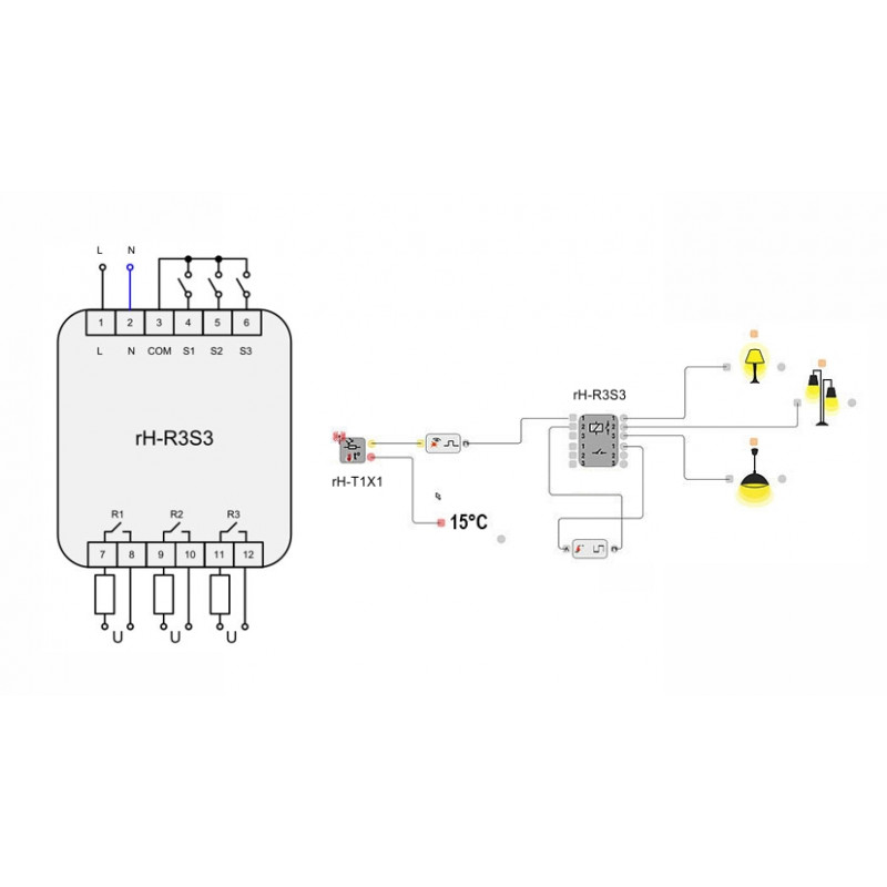 Na zgornjem diagramu temperaturni in svetlobni senzor rH-T1X1 nadzoruje osvetlitev in zagotavlja informacije o trenutni temperaturi. Osvetlitev se primerja s primerjalnimi nastavitvami in odvisno od rezultata, svetilka na prvem izhodu releja rH-R3S3 ali rH-R3S3 LR je vklopljena ali izklopljena.