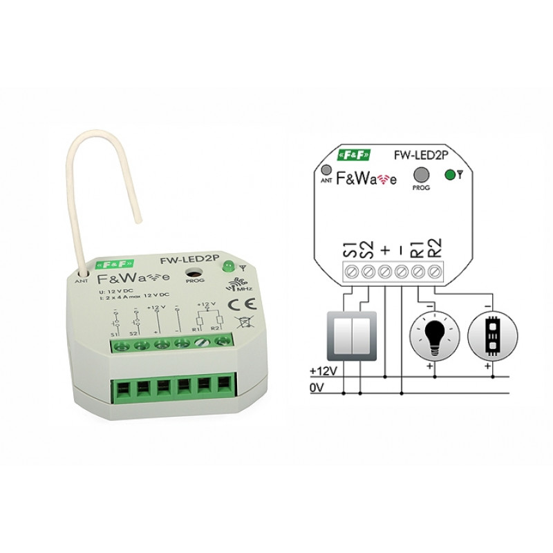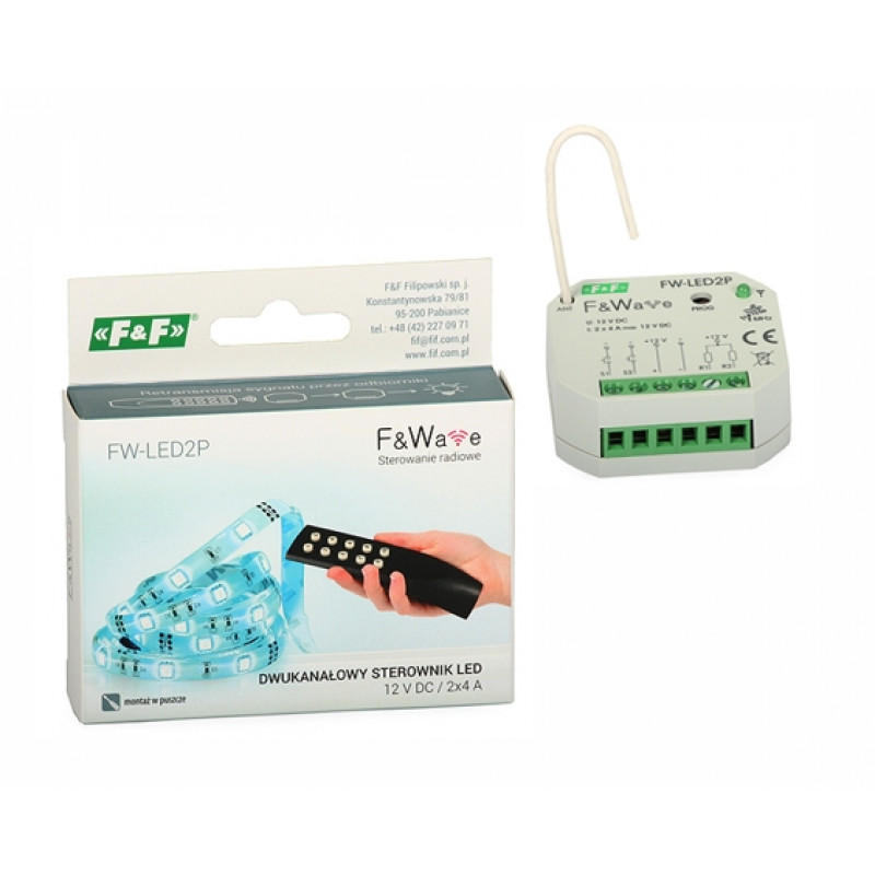 Brezžični LED krmilnik FW-LED2P je zasnovan za krmiljenje dveh LED svetlobnih virov z napetostjo 10-16 VDC. Nadzor lahko izvedete na daljavo s katerimkoli kontrolorji / oddajniki sistema F & Wave in / ali lokalno. Naprava lahko vklopi / izklopi priključene LED svetlobne vire in spremeni njihovo svetlobno intenziteto (PWM).