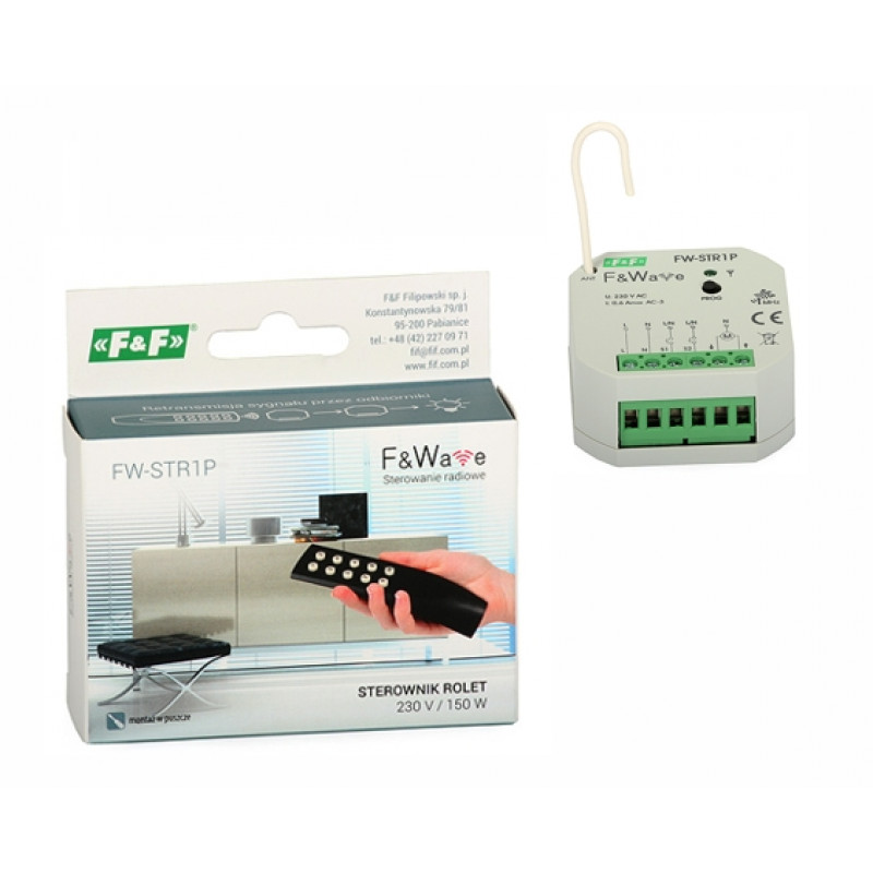 Modul FW-STR1P je 3-polni rele z brezžičnim vmesnikom in dva vhoda za lokalni nadzor. Krmilnik prejme informacije z daljinskega upravljalnika ali lokalnih gumbov, da spusti / dvigne žaluzije ali rolete.