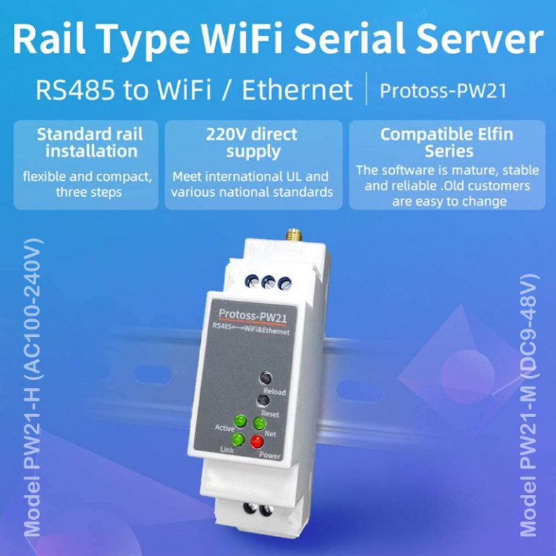 Protoss strežniški modul PW21-M izvedba DC 9-48V zagotavlja krmiljenje vmesnika RS485 preko povezljivosti Ethernet ali Wi-Fi na internetni protokol IP katere koli naprave. Protoss PW21 integriranje krmilnik TCP/IP, pomnilnika, oddajanje 10/100M Ethernet, hitra serijska vrata in integrira popolnoma razvito omrežno skladnost TCP/IP in eCos OS. Protoss PW21 vključuje tudi vgrajeni spletni strežnik, ki se uporablja za oddaljeno konfiguracijo, spremljanje ali odpravljanje težav s priključeno napravo.