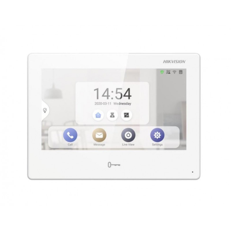 DS-KH9310-WTE1(B) je hišni videotelefon, ki spada v IP video domofonski sistem Hikvision. Ponuja pregleden uporabniški vmesnik, ki ga upravljate preko 7" TFT IPS LCD zaslona na dotik z ločljivostjo 1024 x 600 slikovnih pik, na katerem lahko udobno spremljate obiskovalca na zunanjem zvoncu, z njim komunicirate in samostojno odprete do 2 ključavnici. je tudi vgrajen mikrofon in zvočnik, zahvaljujoč katerima lahko opravljate klice preko SIP (samo zvok).Videofon lahko napajate preko 12V DC priključka ali preko 802.3af PoE.Naprava porabi največ 8W .