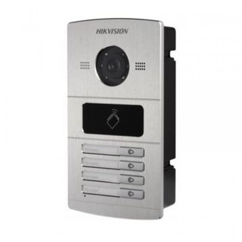Hikvision IP vrata postaja z vgrajeno 1.3Mpx kamero, štiri tipke, z zvočniki in mikrofonom, vključno z vgrajenim bralnikom IC kartic. Fotoaparat lahko dodate v katero koli napravo NVR kot ločen video kanal in posnamete.