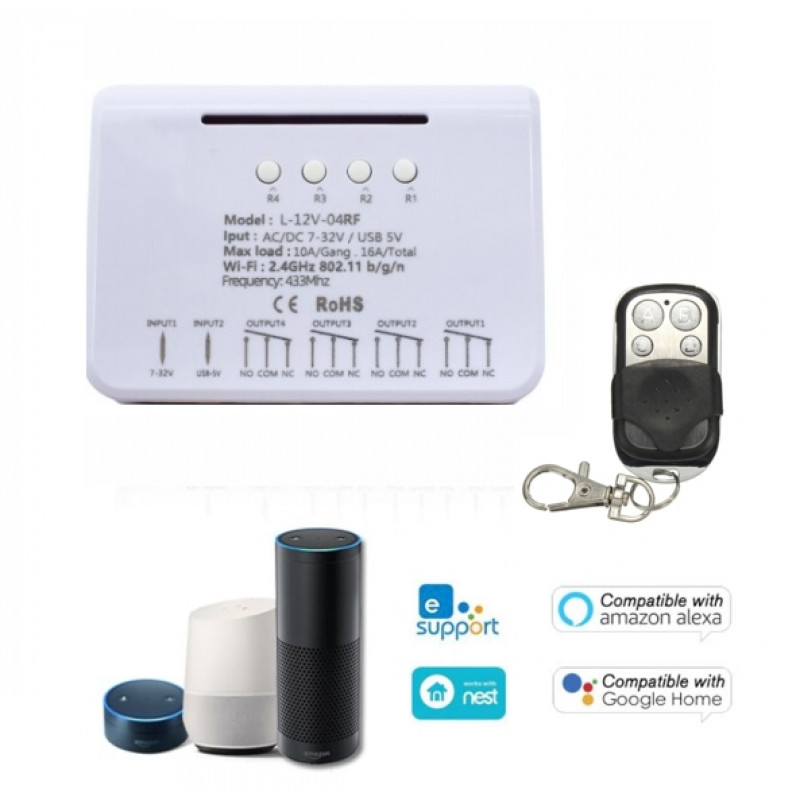 WiFi Smart pametno stikalo DiY Switch za napajanje AC/DC 7-32V za krmiljenje 4CH z podporo RF433 in alikacije EweLink. Ta cenovno ugoden krmilnik uporabnikom omogoča oddaljen vklop / izklop gor spojenih naprav različnih vrst in blagovnih znamk prek aplikacije EWeLink od kjer koli na svetu in kadar koli, med tem ko lahko stikalo upravljate tudi z RF433 daljinci, to delovanje je omejeno na domet naprave. Imate možnost časovnih nastavitev urnikov vklopa in izklopa. Podprti so tudi načni zapiranja / samozaklepanja. V načinu samozaklepanja lahko uporabniki v trenutku vklopijo / izklopijo povezane naprave. V načinu inching lahko uporabniki izbirajo na dva načina: vklop 1s in nato samodejni izklop, izklop 1s in nato samodejni vklop.