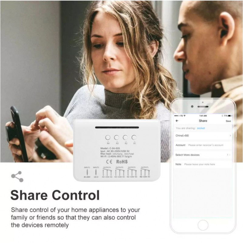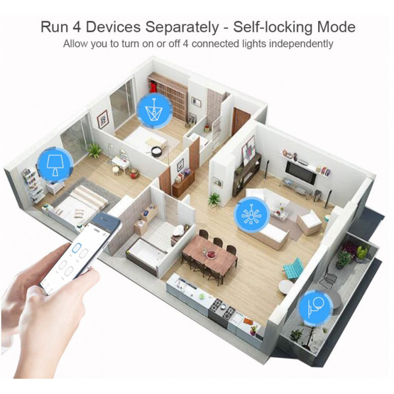* Podpira vklop ali izklop za 4CH priključenih naprav neodvisno med sabo * Podpira časovnik in urnik nastavitev vklaplanja in izklaplanja sistemov po kanalih * Podpira skupno rabo za več uporabnikov družine oz. skupine * Podpira omrežje WiFi. Podpira več pametnih stikal WiFi na enem pametnem telefonu. * Podpira sledenje stanja: stanje naprave pravočasno posreduje v oblak app EweLink. * Podpira daljinsko vklop ali izklop priključenih naprav, na primer luči, električnega grelnika za vodo, električnega štedilnika, ventilatorjev, klim, električne zavese itd * Glasovni nadzor: popolnoma združljiv z "Amazon" Alexa, za Google Home / Nest, IFTTT