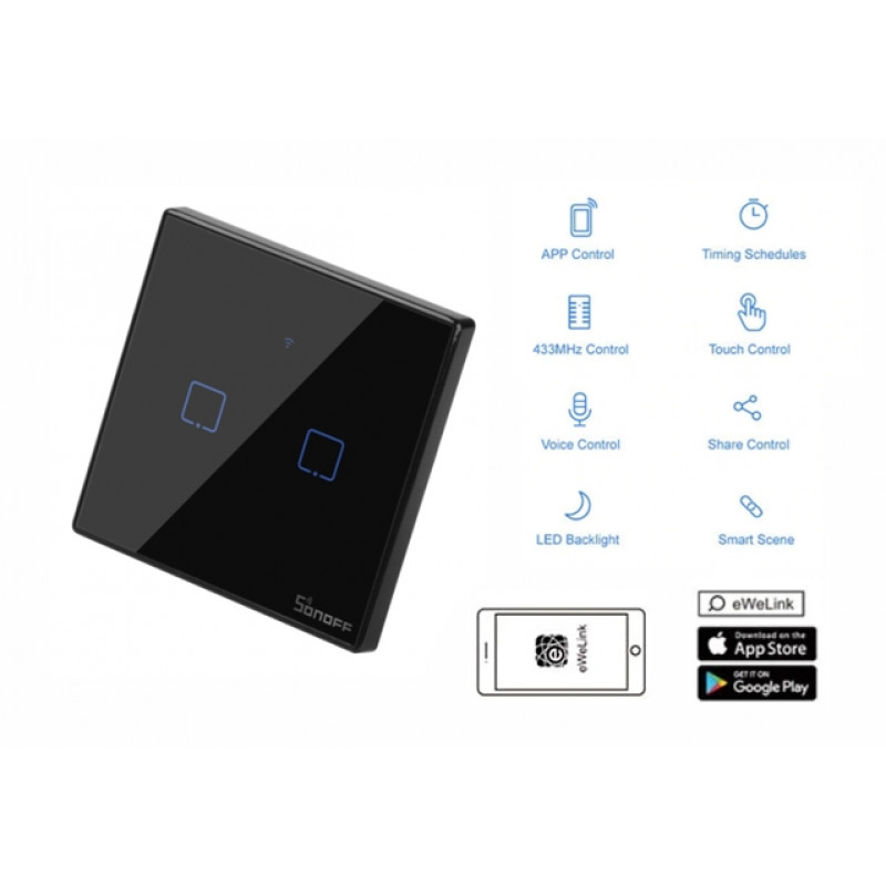 WiFi Smart eWeLink SonOff zidno dvo polno stikalo oz. krmilni modul je naprava za daljinsko pametno upravljanje razsvetljave ali naprav z aplikacijo eWeLink preko dotika, z upravljalnikom, zvočnega ter wlan domačega ali mobilno daljinskega upravljanja naprav 230V do 2A/6A, omogoča pametno upravljanje, daljinsko krmiljenje naprav, omogoča varčevanje energije, zaščito naprav in popolno kontrolo na lokalnem in daljinskem nivojo nad napravo preko interneta.
